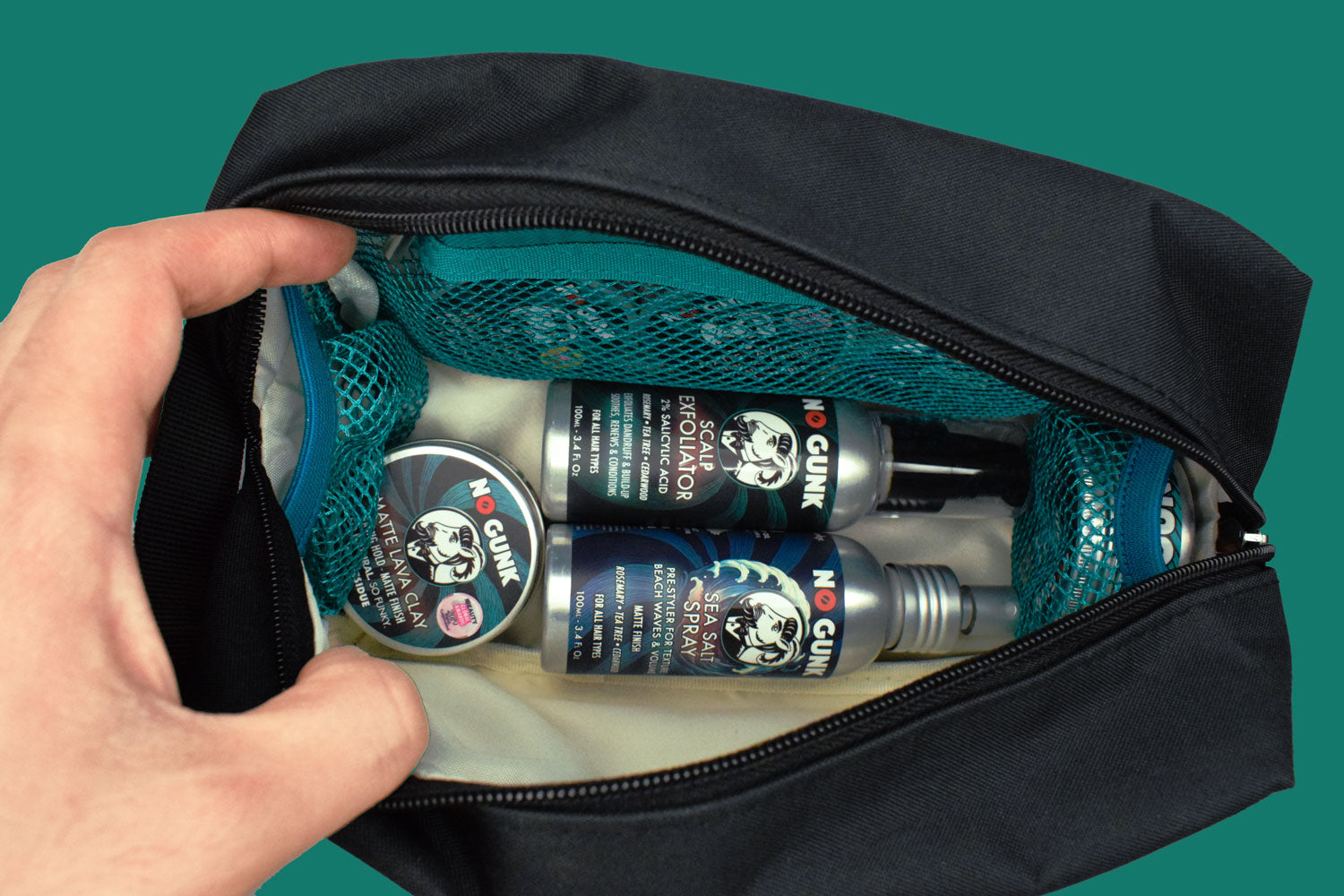 Robuste 100% Polyester Grooming Bag mit NO GUNK Logo und Tragegriff zum einfachen Tragen oder Aufhängen.